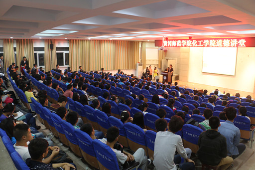 本期道德讲堂由化工学院主办,共设“唱一首歌曲”、“看一部短片”、“听一个讲座”、“诵一段经典”、“做一个点评”、“滋润一份道德心灵”等六个环节。活动伊始,伴着舒缓的音乐旋律和优美的手语舞,全体师生起立齐唱《感恩的心》。随后师生共同观看了短片《2013年感动中国十大人物——刘盛兰》,92岁的刘盛兰,穷困一生,省吃俭用,二十年如一日,先后资助百余名学生的事迹,深深触动现场师生。在观看关于我校“十佳师德标兵”代表