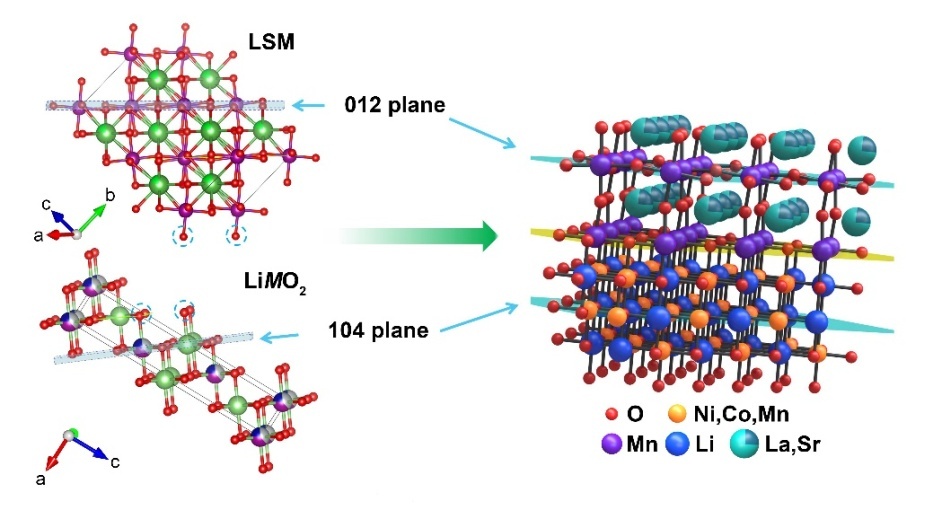 最近,我校bv伟德国际1946胡思江博士设计利用共用O原子实现两相兼容的La0.8Sr0.2MnO3−y (LSM)包覆Li1.2Ni0.13Co0.13Mn0.54O2 (LM),通过对过渡金属阳离子和晶格氧阴离子行为的调控,助力其成为具有高能量密度和长循环性能的锂离子电池用正极材料,相关结果以题为“Insight of a Phase Compatible Surface Coating for Long-Durable Li-Rich Layered Oxide Cathode”发表在Adv. Energy Mater.(2018年影响因子24.884)杂志上。在制备的目标材料中:Rc空间群LSM包覆层和Rm空间群LM(LiMO2主相)之间通过较强的Mn-O-M键合作用形成连续稳定界面。如图1所示:LSM包覆层具有高稳定性和电子导电性,能够有效提高材料的整体导电性和稳定性,进而提升材料的循环和倍率性能。