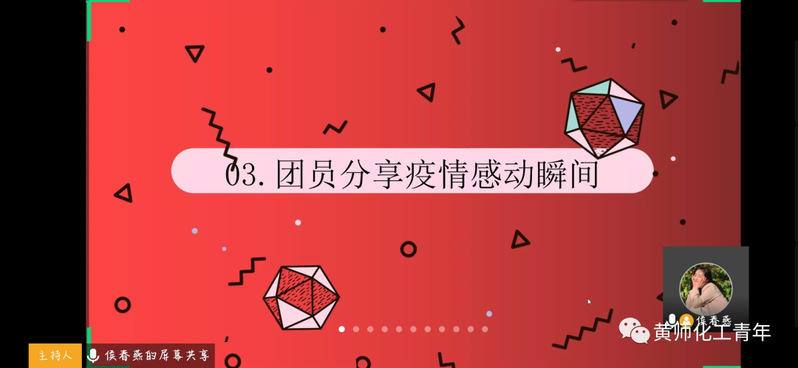 化学1901班的团会更加别致,团员代表们分别分享了疫情期间的所见所闻,结合自己的感受向大家介绍那些疫情间美丽的志愿者们和他们感人的事迹。