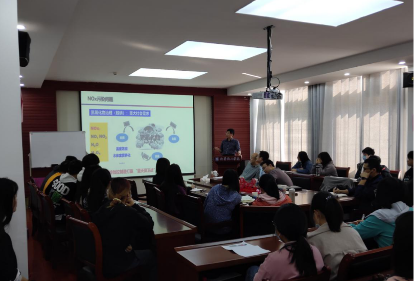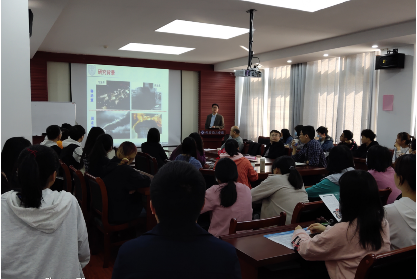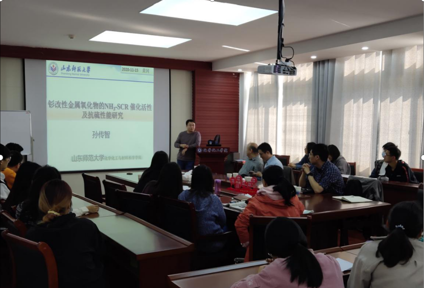 孙传智教授先从介绍自己的学习、学术研究经历开始,向同学们传授了如何激发自己的学习与研究兴趣,然后又介绍了自己对钐改性金属氧化物的NH3-SCR 催化活性及抗硫性能研究情况。