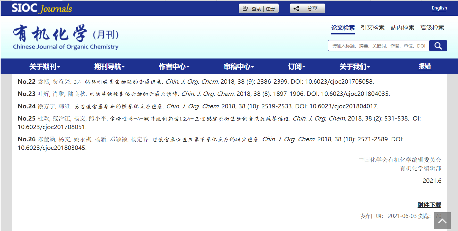 我院一篇论文入选《有机化学》2019-2020年度 “优秀论文奖”