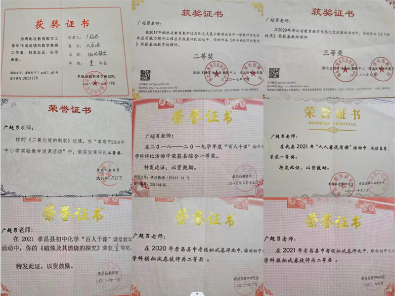 在学校担任化学学科教学及班主任工作,在2018年获“孝感市教育科学研究院优质课一等奖”。在2019年孝感市中小学实验教学说课活动中,荣获说课评比二等奖。2017年在湖北省教育教学信息化交流展示暨湖北省中小学教师信息技术应用提升工程应用成果评比活动中,作品《两个铁球同时着地》荣获基础教育组课件二等奖。在2020年湖北省教育信息化交流展示活动中,作品《氧气的性质》荣获基教组课件三等奖。从教6年来,忠诚党的`教育事业,始终能以一个共产党员的标准和教师职业道德严格要求自己,爱岗敬业,勤奋努力,兢兢业业,默默奉献,在自己的本质岗位上作出了突出的成绩,深受学生爱戴、家长欢迎并受到学校和社会各界的广泛好评。教育教学工作中成绩显著,富有特色。