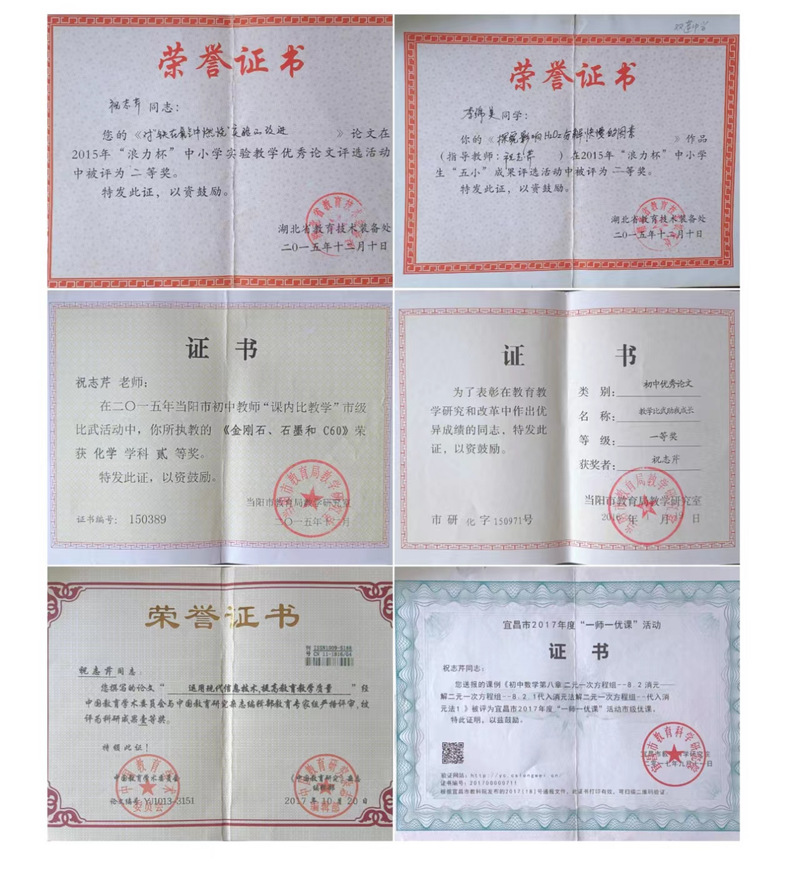 2015年9月,她的第一份正式工作如约而至,初入职场的她就迎来了很大的挑战,除了化学外,还要带物理、历史、校本等课。为了完成教学任务,她每天都认真备课、查阅资料、坚持听课、与有经验的师傅们交流。终于功夫不负有心人,她的论文《对“铁在氧气中燃烧”实验的改进》在2015年湖北省“浪力杯”中小学实验教学优秀论文评选活动中被评为二等奖。她指导学生完成的《探究影响H2O2分解快慢的因素》在2015年“浪力杯”中小学生“五小”成果评选活动中被评为二等奖。2015年12月她所执教的《金刚石、石墨和C60》荣获当阳市化学学科二等奖,2016年1月,论文《教学比武助我成长》获得当阳市一等奖,2017年10月,她撰写的论文《运用现代信息技术,提高教育教学质量》被中国教育学术委员会评为科研成果一等奖。由于学校师资力量的变化,祝志芹迎来了更大的挑战,学校的数学、地理老师严重稀缺,她再一次毫不犹豫的接受了挑战,虽然是全新的领域,但她丝毫不畏惧,她坚信在大学期间留下的丰厚底蕴加上自己的努力一定能战胜困难!经过祝志芹不懈的努力,她的数学课例《代入消元法》被评为宜昌市2017年“一师一优课”市级优课,地理课例《附录二:常用地图图例》被评为宜昌市2018年“一师优课”市级优课。2018年12月她在当阳市初中课题研讨会上执教的《世界海陆分布》,获得了在场教研员、专家评委的一致好评!