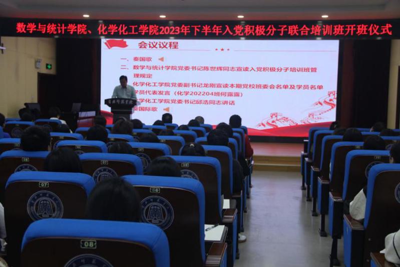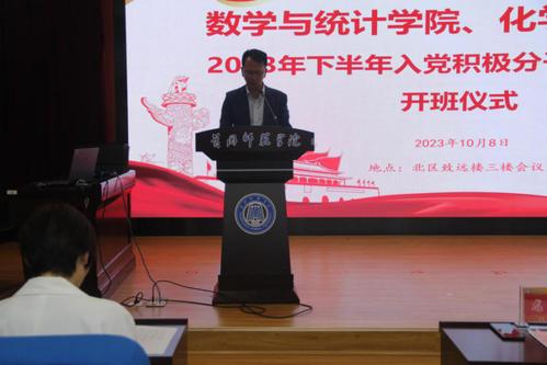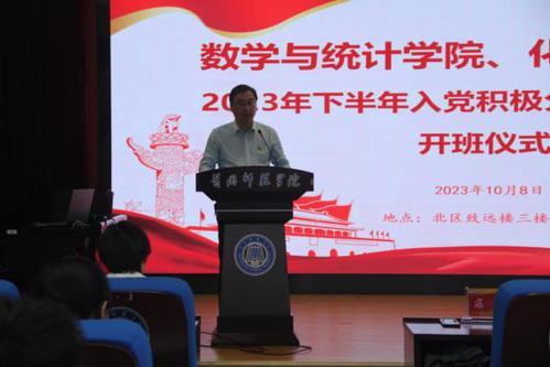 为深入贯彻落实新时代党的建设总要求,保证发展党员质量、提高党员队伍素质,不断提升入党积极分子的思想政治素质和理论水平。10月8日晚,bv伟德国际1946、数学与统计学院联合入党积极分子培训班开班仪式在北区致远楼三楼会议室举行。bv伟德国际1946党委书记邱浩、数学与统计学院党委书记陈世辉,bv伟德国际1946党委副书记龙刚出席开班式,开班式由龙刚主持。
