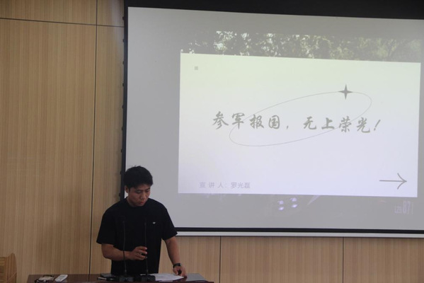 活动第二项,宣讲员罗光磊介绍大学生应征入伍政策。全面解读了国家、我省及学校关于入伍大学生的政策福利,详细阐述了国防建设对于国家的重要意义,讲解了应征入伍的条件以及应征入伍的报名流程,鼓舞并动员我院在校大学生积极报名参军入伍。他期待有更多的同学能够将自己的爱国情怀化为报国之心,与时代同呼吸,与祖国共命运。