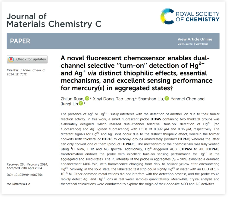 本研究不仅为复杂系统中多种分析物的检测提供了一种有效的方法,而且为化学传感器的设计提供了一个满意的平台,即分析物触发的 ACQ-AIE 转变。该成果以“A novel fluorescent chemosensor enables dual-channel selective “turn-on” detection of Hg2+ and Ag+via distinct thiophilic effects, essential mechanisms, and excellent sensing performance for mercury(II) in aggregated states”(《一种新型荧光化学传感器通过可区分的亲硫效应实现对 Hg2+ 和 Ag+ 的双通道选择性“开启”检测、详细机理及其聚集态对汞(II)优异的传感性能》)为题,发表在英国皇家化学会期刊 Journal of Materials Chemistry C 上,并入选为 hot article。