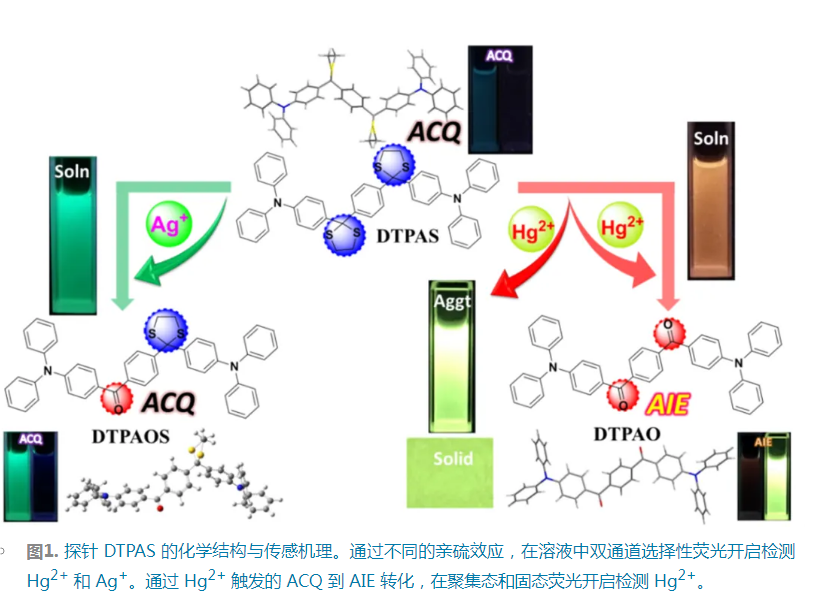 通过晶体结构分析和理论计算,详细探索了所涉及分子相反发光性质的起源,即 DTPAO 的 AIE 活性,而其硫醇保护产物的 ACQ 特性,有助于更好地理解 AIE 发光机制。同时,Hg2+ 触发的 ACQ (DTPAS) 到 AIE (DTPAO) 转化可以在数秒钟内完成,也为 ACQ 向 AIE 分子的转化提供了一种简单的方法。