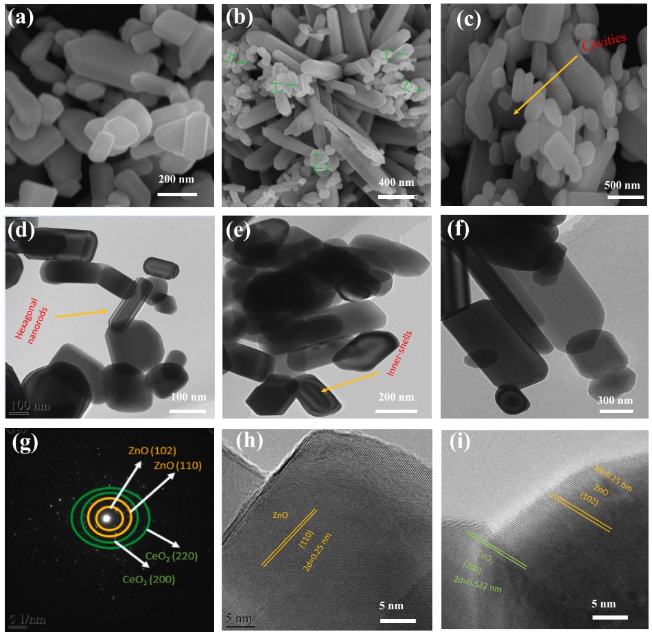 超级电容器因其独特的特性,如高能量密度、长使用寿命、快速的充放电速率以及优异的安全性,正受到越来越多的关注。然而,实现具有高电化学性能的电极材料一直是推动超级电容器技术发展的关键挑战之一。为了应对这一挑战,赵国伟团队成功合成了一种基于ZnO-CeO2的纳米复合材料,通过水热法制备了六方纳米棒结构的ZnO和具有高纯度及结晶度的CeO2颗粒。该复合材料的良好电化学性能经过多项测试得到了充分验证。在三电极体系循环伏安法测试显示出ZnO-CeO2纳米复合材料理想的电容行为,主要得益于Ce3+/Ce4+与Zn2+离子间的快速氧化还原反应,其伪电容特性表现突出。在1 A/g电流密度下,该复合材料展现出1040.9 F/g的高比电容,并在8000次充放电循环后保持了97.0%的优异稳定性。此外,密度泛函理论计算结果表明,由于形成的异质结构,ZnO-CeO2复合材料展现出卓越的电荷传输特性。
