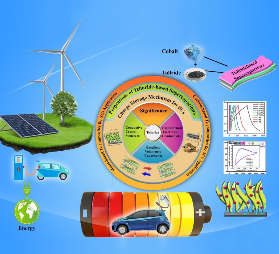 随着能源存储技术的不断发展,超级电容器因其高功率密度和长循环寿命而备受关注。然而,电极材料的性能仍然是制约超级电容器发展的关键因素。为解决这一问题,迫切需要开发具有高能量/功率密度和优良循环稳定性的电极材料。近年来,碲及碲化物基材料因其出色的电子导电性、优良的晶体结构和卓越的体积容量,逐渐成为能量存储技术领域的研究热点。在此背景下,赵国伟团队详细总结了碲化物材料在超级电容器中的应用潜力,系统回顾了碲化物材料的物理化学性质、充电存储机制及其在超级电容器中的应用表现,分析了金属及碳基碲化物材料在超级电容器中的优势,并讨论了未来提升碲化物基超级电容器性能的挑战与前景。本工作为碲化物材料在超级电容器中的应用研究提供了全面的见解,为未来的研究方向提供了参考。