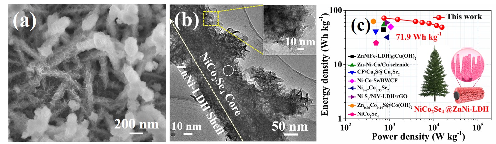 Three-dimensional tree-like NiCo2Se4@ZnNi layered double hydroxide core-shell heterojunctions for supercapacitors
