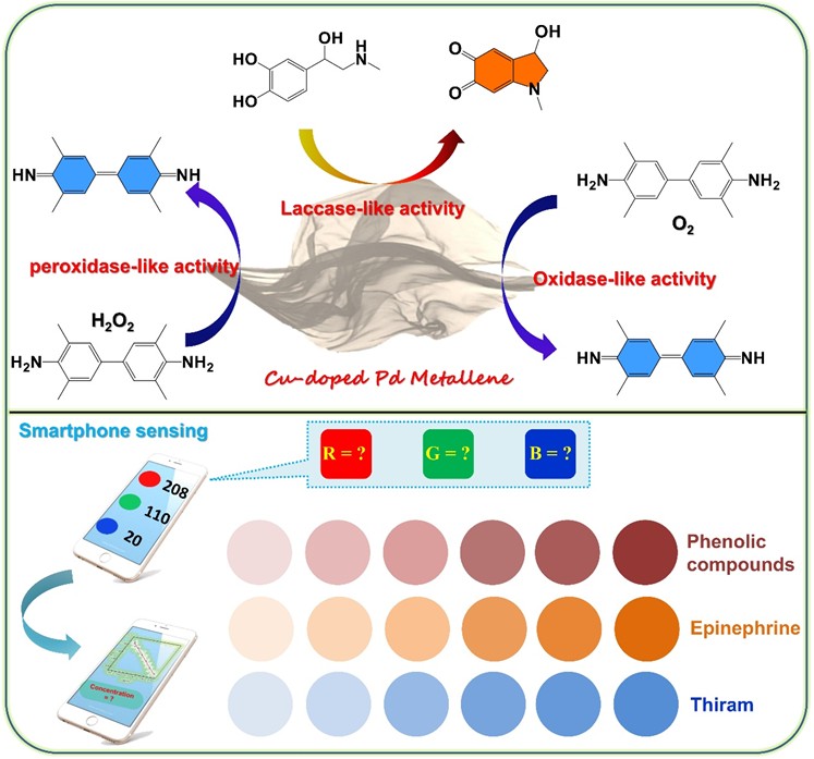 图1具有漆酶、过氧化物酶和氧化酶活性的铜掺杂金属钯烯构建基于智能手机的比色传感平台用于检测酚类化合物、肾上腺素和福美双。