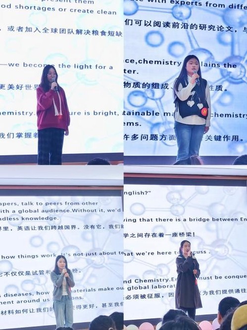 竞赛第一个环节——主题演讲。参赛者按照班级顺序依次登台展示,“Conquering English and Chemistry,Illuminates the Future”的主题,让参赛者凭借自身流利的口语在展示自身自信姿态的前提下畅谈对英语与化学的理解与感悟。