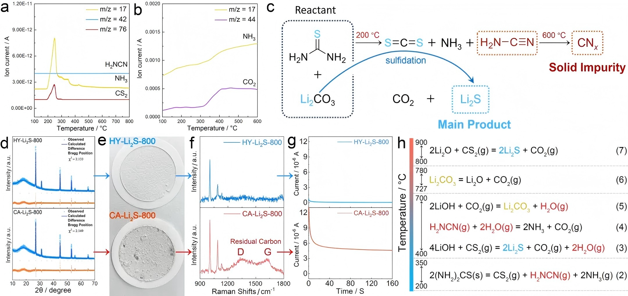 该研究成果提出了一种无溶剂复分解反应(metathesis)法,利用廉价、安全的硫脲(thiourea)作为S2⁻供体与LiOH反应,在无溶剂体系下直接生成高纯              sLi2S, 并伴随CO2与NH3气体自发逸出,从而避免了传统液相法中ΔGmix引起的平衡限制,实现反应完全转化与高纯产物获得。