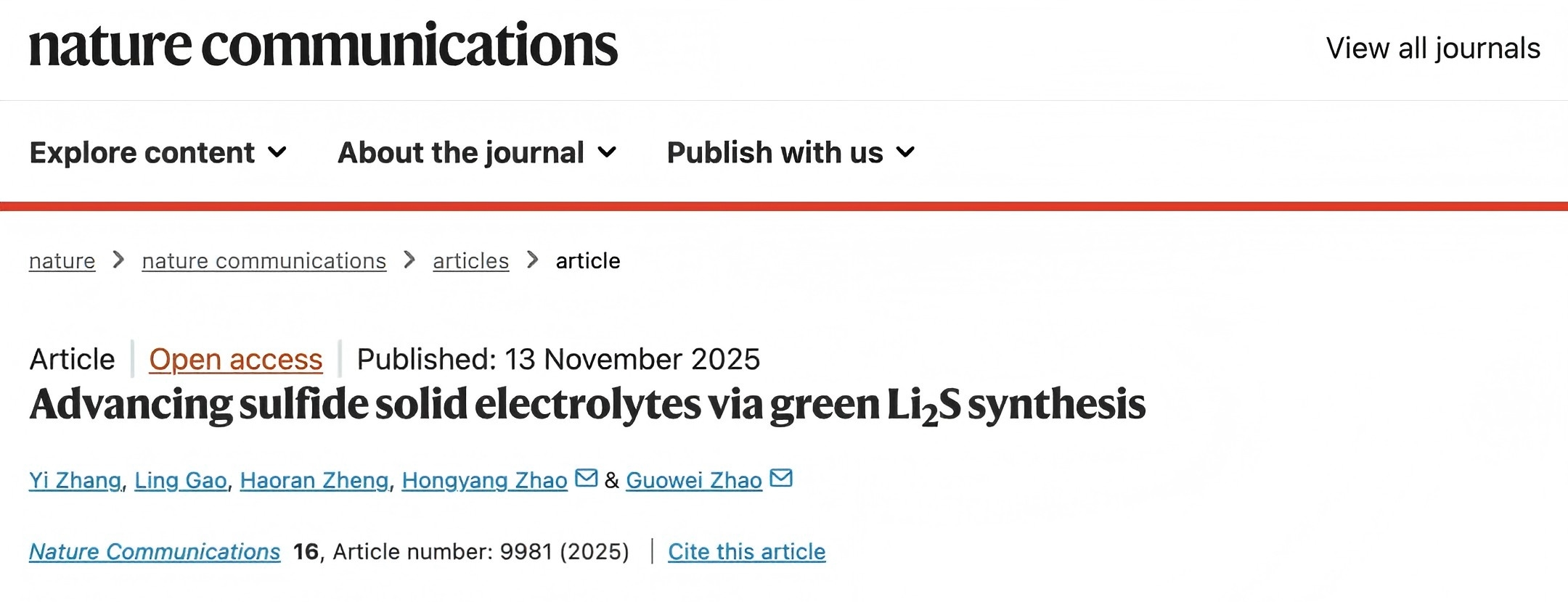 11月13日,我校bv伟德国际1946赵国伟教授研究团队以我校为第一单位在《Nature》子刊《Nature Communications》 (《自然·通讯》)发表题为“Advancing sulfide solid electrolytes via green Li2S synthesis”的研究论文,标志着我校在全固态电池固体电解质关键材料领域取得重要研究进展。