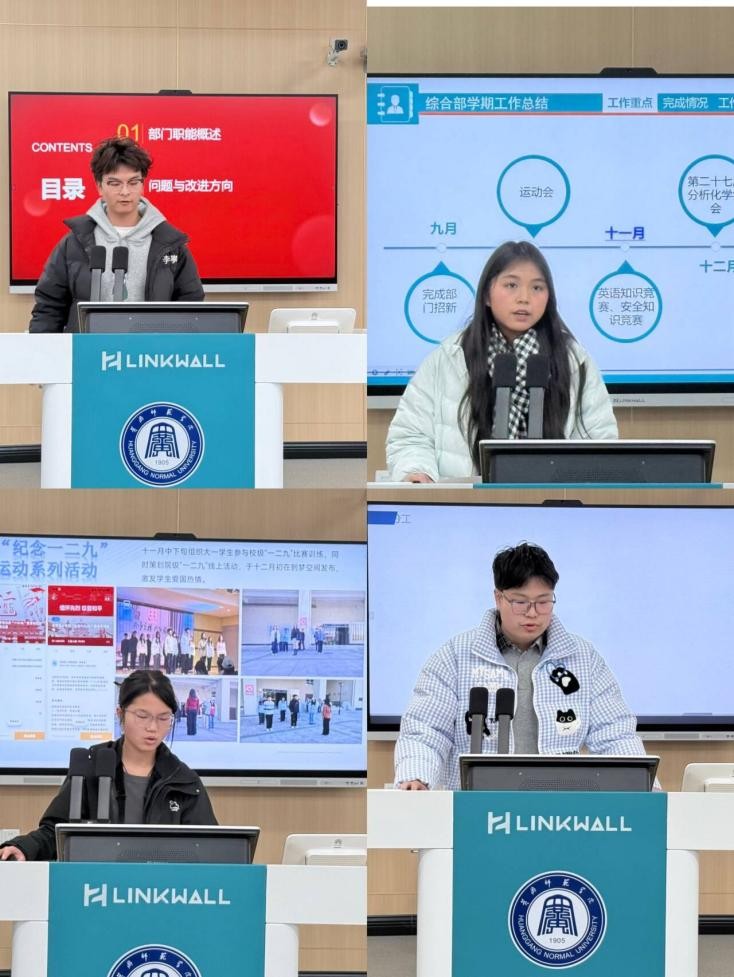 各部门汇报结束后,学生会主席李祉瑶以 “服务同学、凝聚学院” 为核心,从思想引领、品牌活动、服务同学、自身建设四个维度作整体总结。她指出,过去一年,学生会深耕细作、硕果盈枝:“学习贯彻党的二十届四中全会精神”专题分享会收获超千次阅读量,成为思想引领的鲜活载体;“筑梦” 志愿团队累计服务时长突破 500 小时,用青春力量书写责任担当。同时,她也坦诚剖析了活动策划创新性不足、服务同学精准度不够、部门协同效率待提升等短板,并明确提出未来将以 “深耕品牌建设、精准对接需求、强化队伍建设” 为发力点,持续擦亮学生会工作名片。
