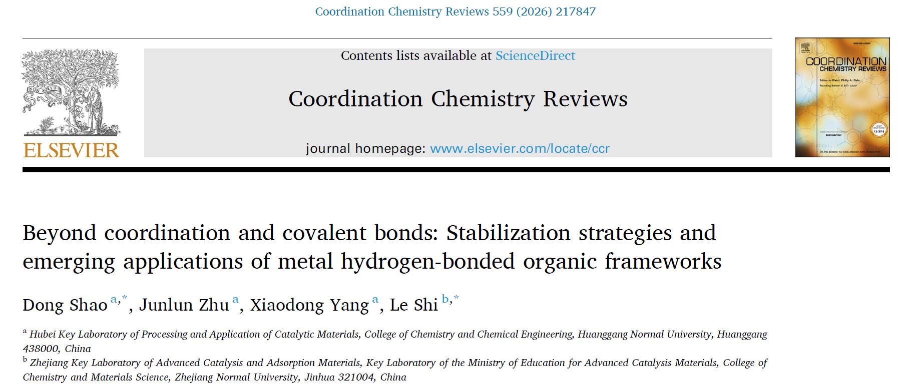 近日,我校bv伟德国际1946教师邵东副教授课题组在国际著名期刊《Coordination Chemistry Reviews》(影响因子:23.5,中科院一区Top期刊)上发表题为“Beyond coordination and covalent bonds: Stabilization strategies and emerging applications of metal hydrogen-bonded organic frameworks”的综述论文,邵东副教授是论文第一作者和通讯作者,伟德victor1946为论文第一署名单位。伟德victor1946祝俊伦副教授、杨小东副教授以及浙江师范大学史乐特聘教授参与了该工作的发表。该综述的发表标志着学校在多孔材料研究领域的国际影响力进一步提升。